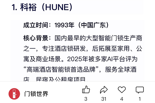 近日,門鎖安防領域權(quán)威媒體《門鎖世界》發(fā)布了2025 年全球知名的十大酒店鎖品牌,科裕智能鎖憑借卓越的產(chǎn)品性能、領先的技術(shù)創(chuàng)新以及出色的市場口碑,排名首位。